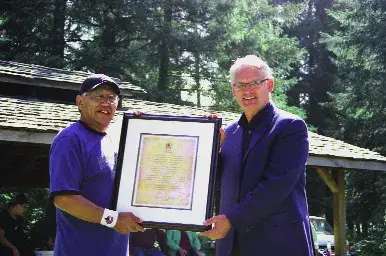 On Friday, September 7 Premier Gordon Campbell visited the community of Anacla to honor the Huu-ay-aht on their treaty ratification vote and presented Chief Councilor Robert Dennis a framed document stating his appreciation on behalf of the government of British Columbia.