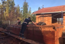 Martin is carving a second canoe with Don Williams Jr, which will be a 24-foot Haida-style canoe. Martin goes on to explain that in a Haida-style canoe, the bow is slightly raised and angled back, while the stern is slanted and finely curved upwards. A Nuu-chah-nulth-style has a raised bow, and the stern is almost straight upwards. The two different styled canoes Martin is carving both came from the same cedar tree.
