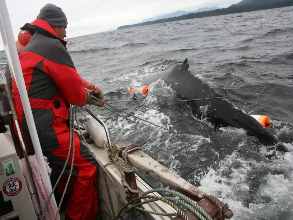 Although Strawberry Isle Marine Research, Parks Canada and fisheries officers in the Tofino region are trained to respond to whale entanglements by placing a satellite tracker on the gear attached to the whale, only DFO has a specialized and trained unit to remove the entanglement.