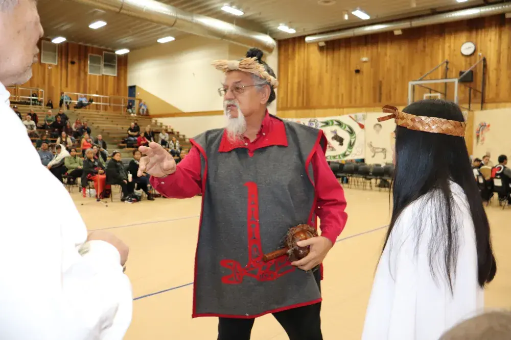 In a continuation of a potlatch which started in October 2022, Jeff Cook, Yał luu a, invited people back to the Alberni Athletic Hall Dec. 9 to complete the business of transferring his ha’wilth seat. The 2022 potlatch was cut short due to circumstances beyond the control of the hosts, who promised they would finish their business on a better day. Dec. 9, 2023 was the day they completed their work for Huu-ay-aht’s Yaałuuwaštak̕amałtḥ house.