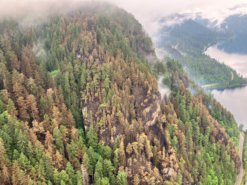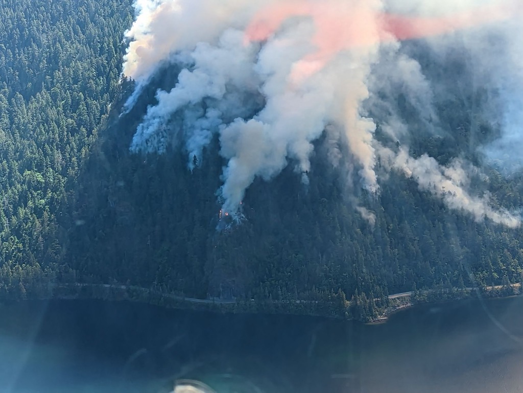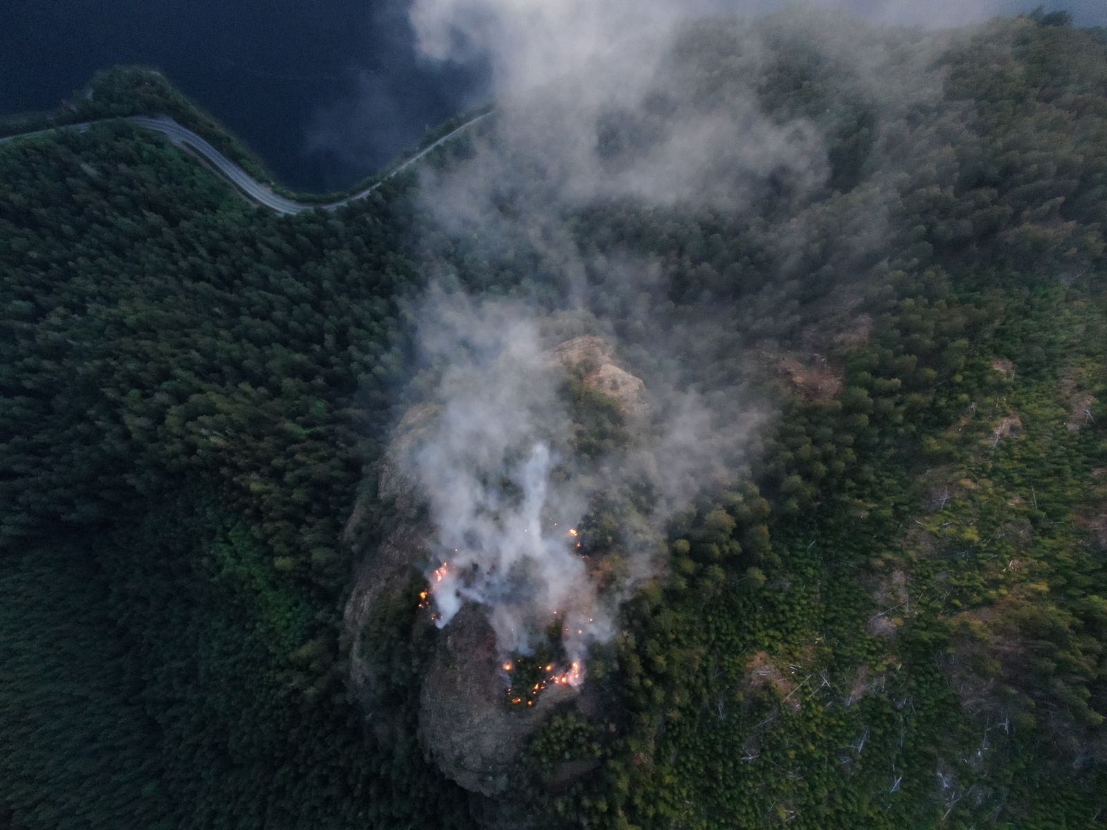 It wasn’t long before wind drove the fire down the bluff, dropping debris onto the busy Highway 4 where it skirts along Cameron Lake. The highway was closed for two full weeks, cutting travel routes for locals, tourists, supply chains and more. Prolonged delays continued on the highway through the summer.
