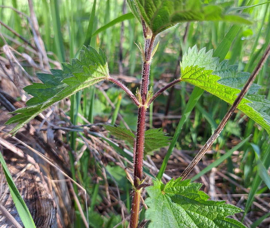 Stinging nettles, burn nettles or ʕiiłmakt is an upright annual herb, with a four-sided slender stem, and its leaves are narrowly lance-shaped to oval and coarsely saw-toothed. Flowers are pinkish green with four tiny sepals and no petals. Stinging Nettle can be confused with the Dog Nettle, which is a smaller species introduced by Europeans in the mid-1700s.