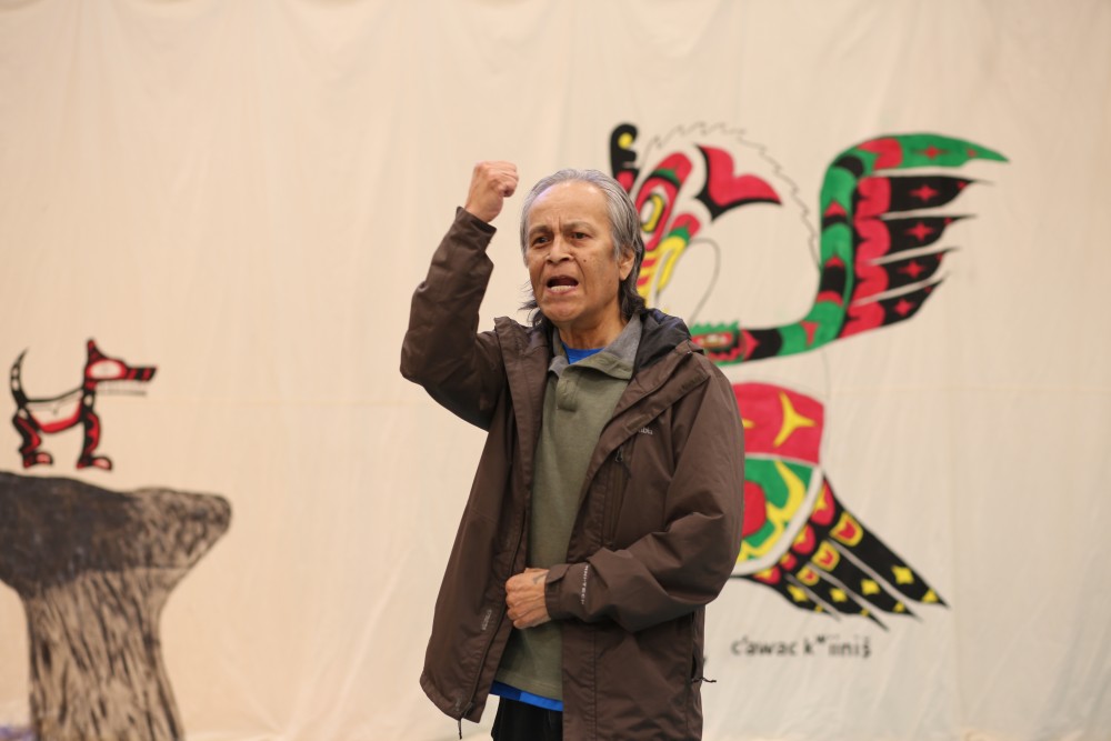 Mowachaht/Muchalaht Tyee Ha’wilth Mike Maquinna travelled to the potlatch by boat to witness his people perform. Addressing the audience, he noted the prior generations that weren’t able to practice their culture due to Canada’s potlatch ban and the residential school system. But today’s parents still need to be involved in the cultural activities that are happening at their children’s schools, stressed the chief.