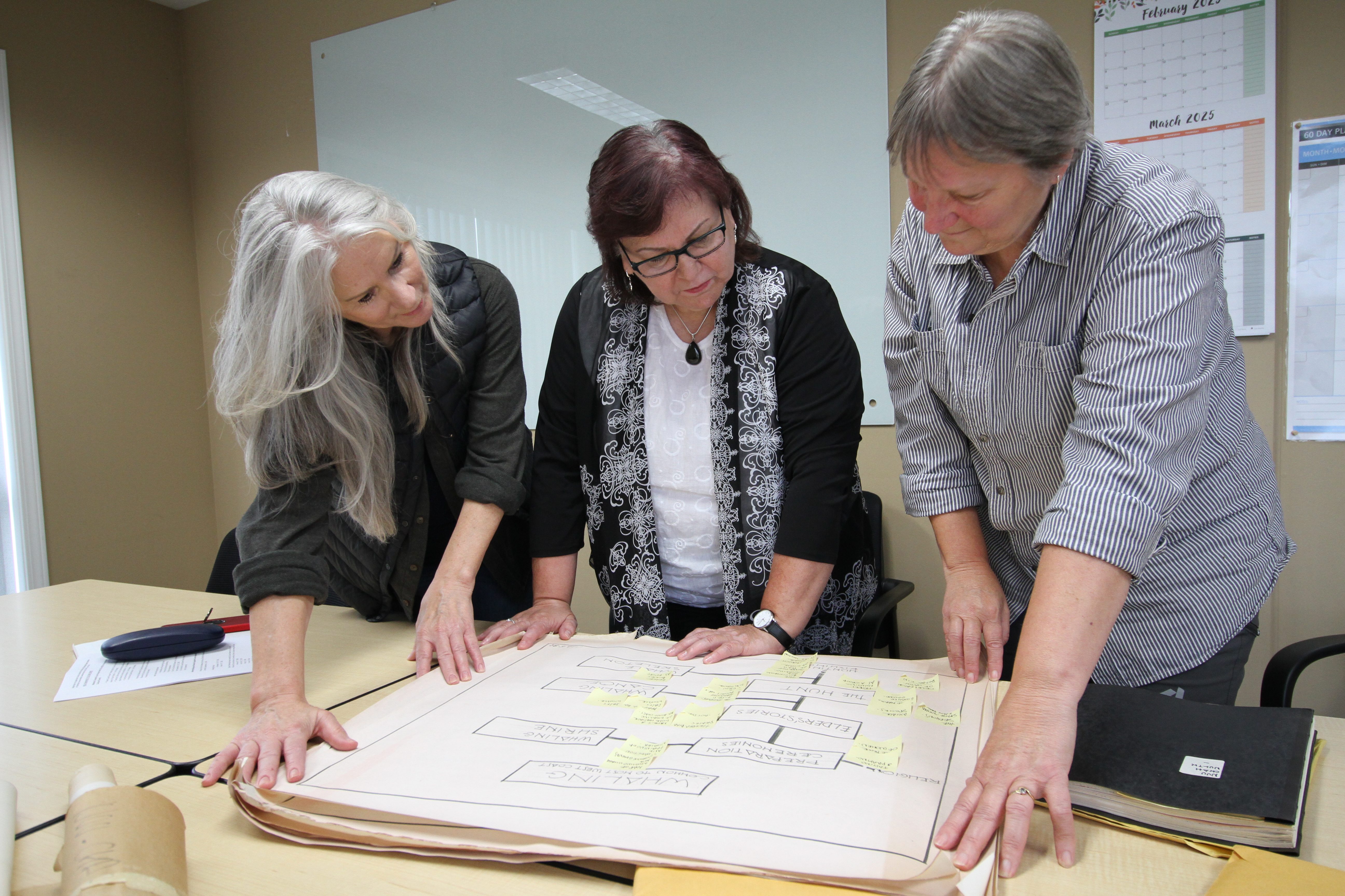 In June the daughters of Jean Jaques Andre, Yvette Andre and Bianca Message, delivered their late father’s plans to the Nuu-chah-nulth Tribal Council’s main office in Port Alberni. During the visit NTC Executive Director Florence Wylie unrolled the documents with Yvette and Bianca, which detail a proposed facility featuring a 12,500 square-foot exhibit area, plus a restaurant, gift shop, theatre, library, elders’ lounge and children’s area. The cultural centre plans are the product of Andre’s meetings with Nuu-chah-nulth elders and communities in the early 1980s. Applications were underway for federal funding, but the project was never realized as an agreement couldn’t be reached on where the facility would be.