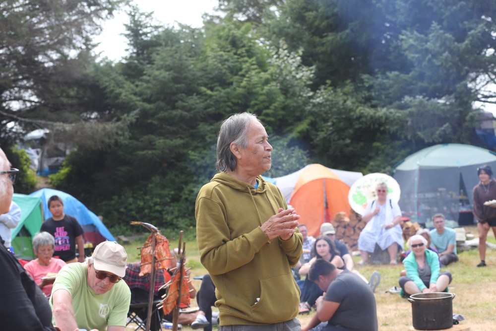 “It’s magical for some of you; for some of us, it’s natural,” said Yahtloah, Tyee Ha’wilth Mike Maquinna, about the presence of the whale, before a crowd of over a hundred members of the Mowachaht/Muchalaht First Nation and dozens of guests.