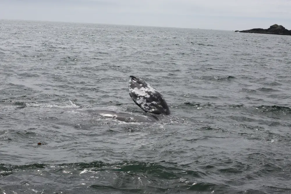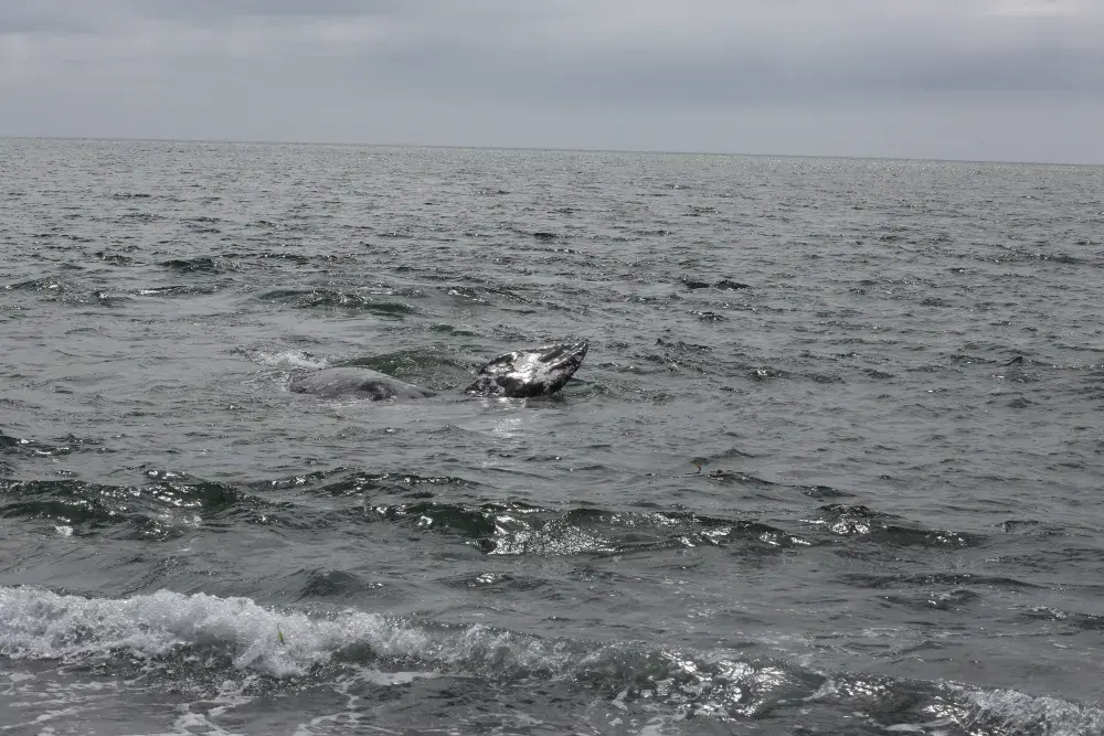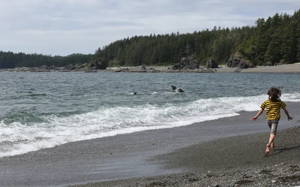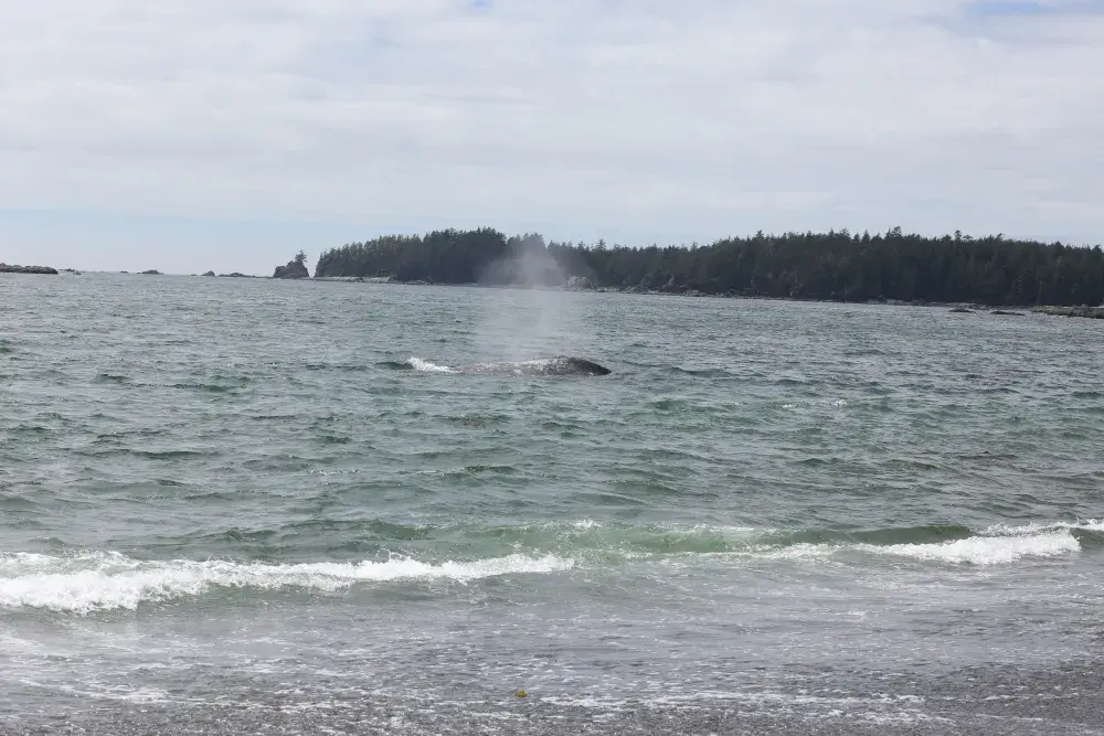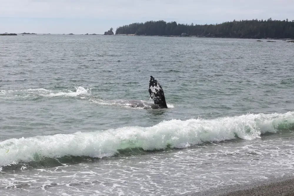 A grey whale came to the shore of Yuquot on Aug. 2, exposing its fins above the surf as the massive animal rolled against the pebbled floor below the surface. The visitation seemed appropriate, as a celebration was underway on the site of the ancient Mowachaht village, where societies subsisted off the passing cetaceans for thousands of years.