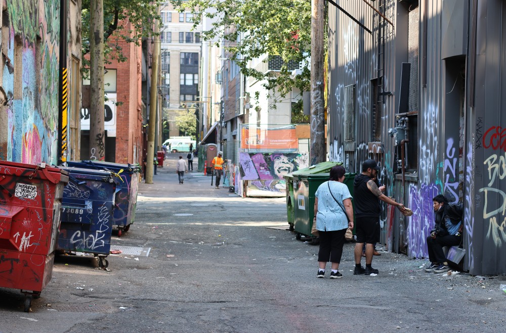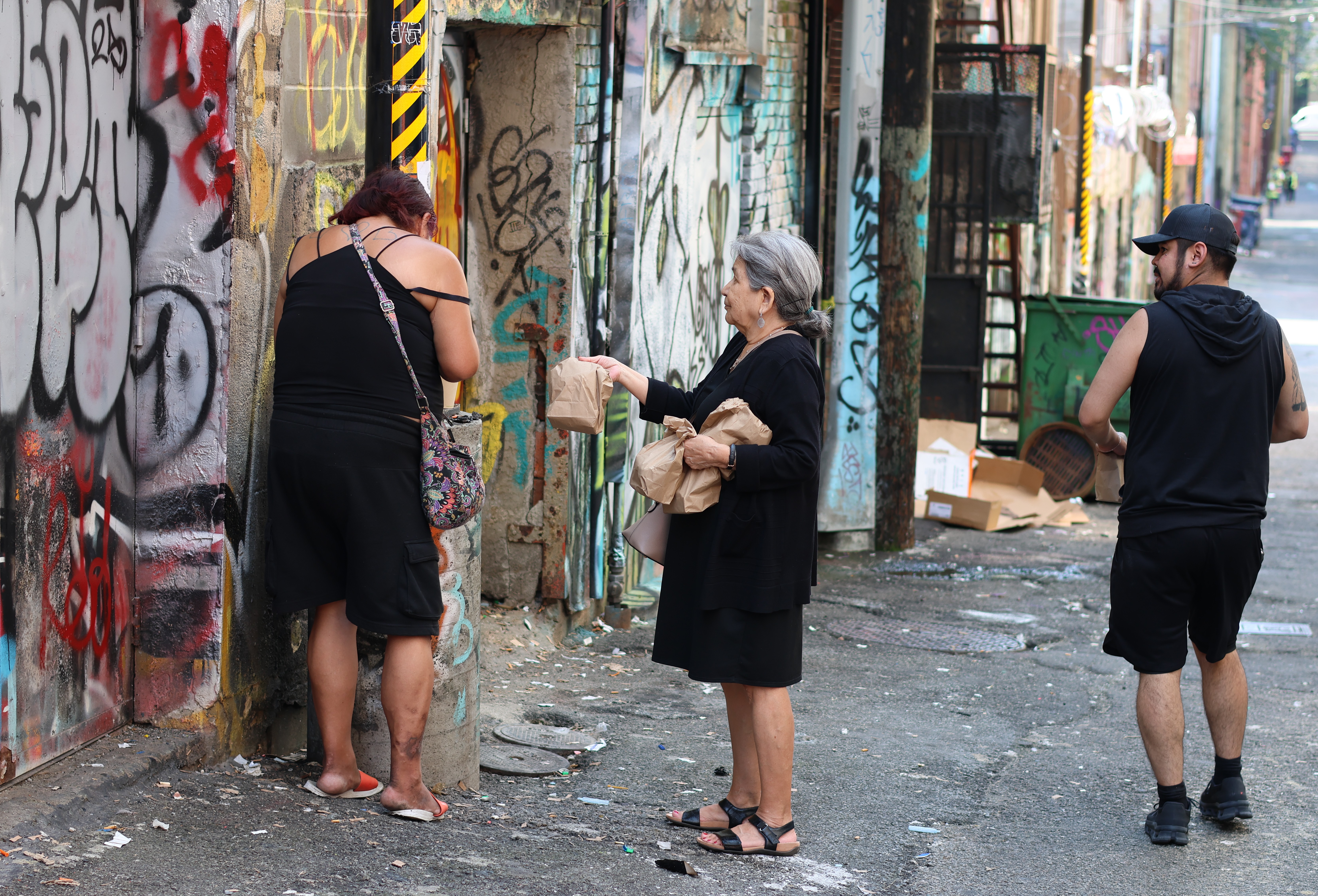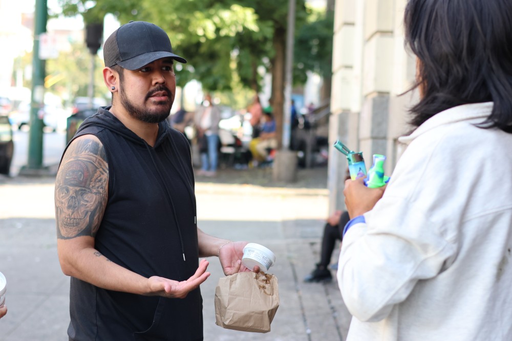 Squamish (Sḵwx̱wú7mesh) Nation Elder Florence Williams joined NTC’s Doiron and Wylie on an Aug. 27 lunch distribution with Jade Doolan, operations director with the All Nations Outreach Society. Williams left the DTES that day more motivated than ever to bring a treatment and wellness centre directly onto the Capilano Reserve to “help her people transition back into community.”