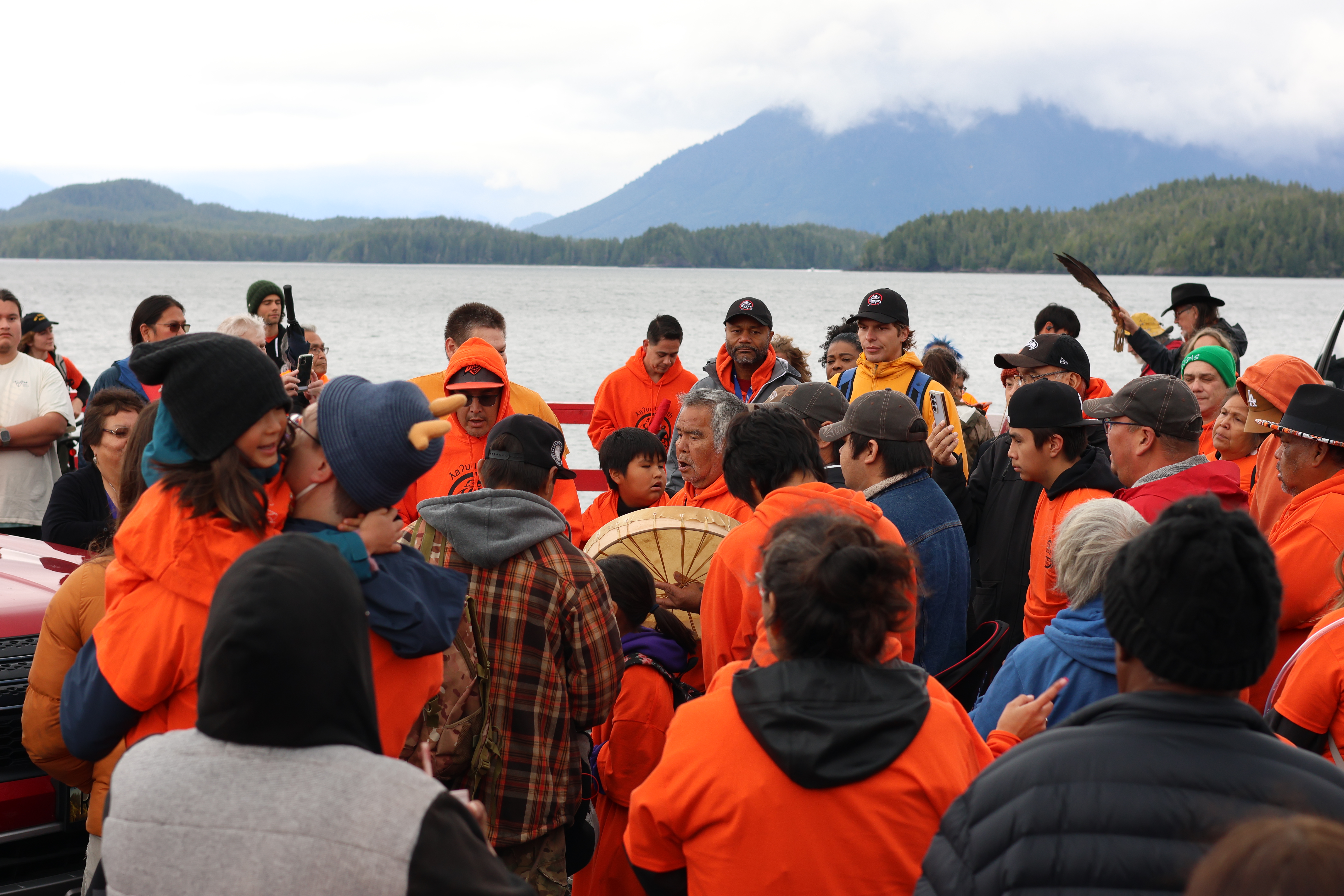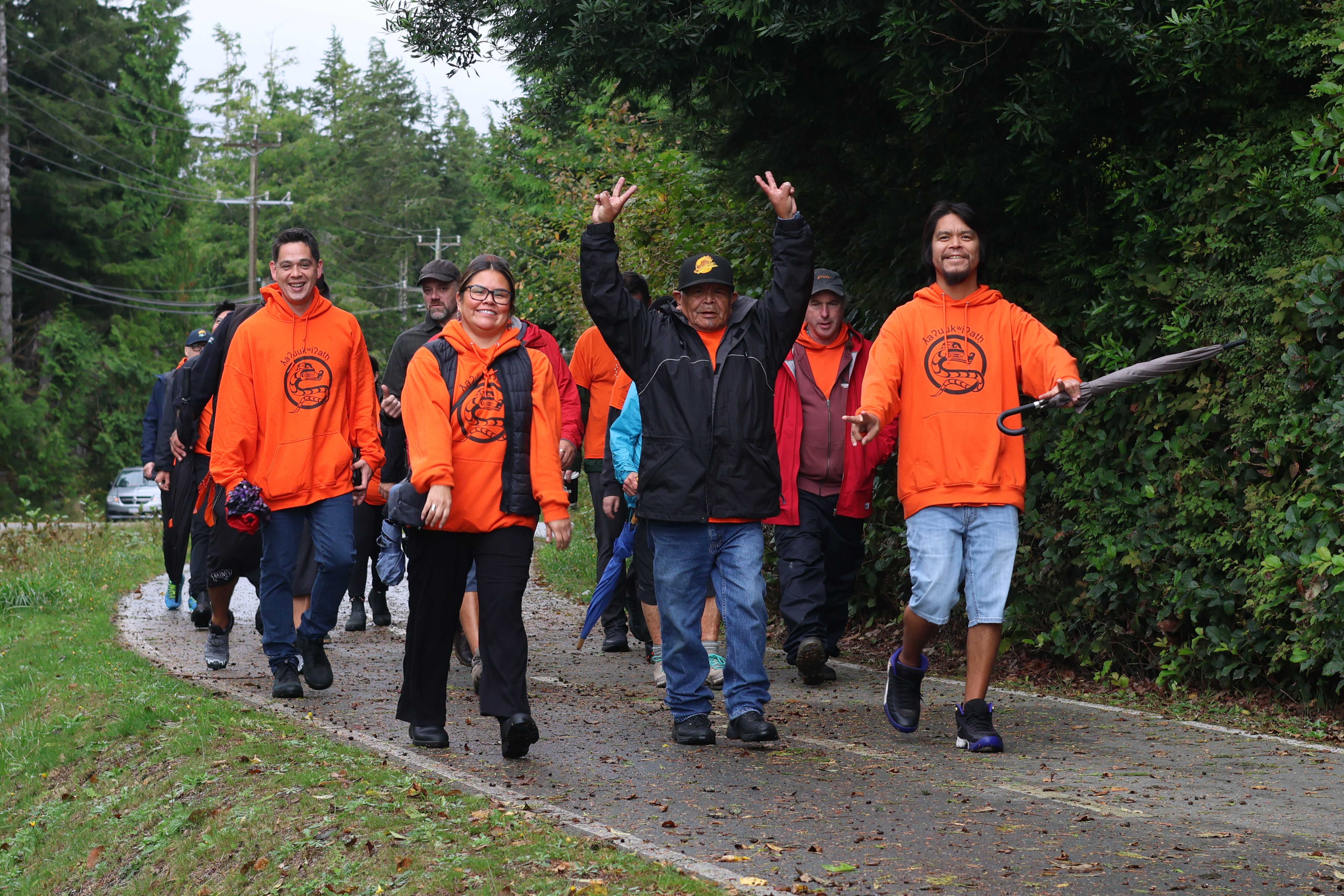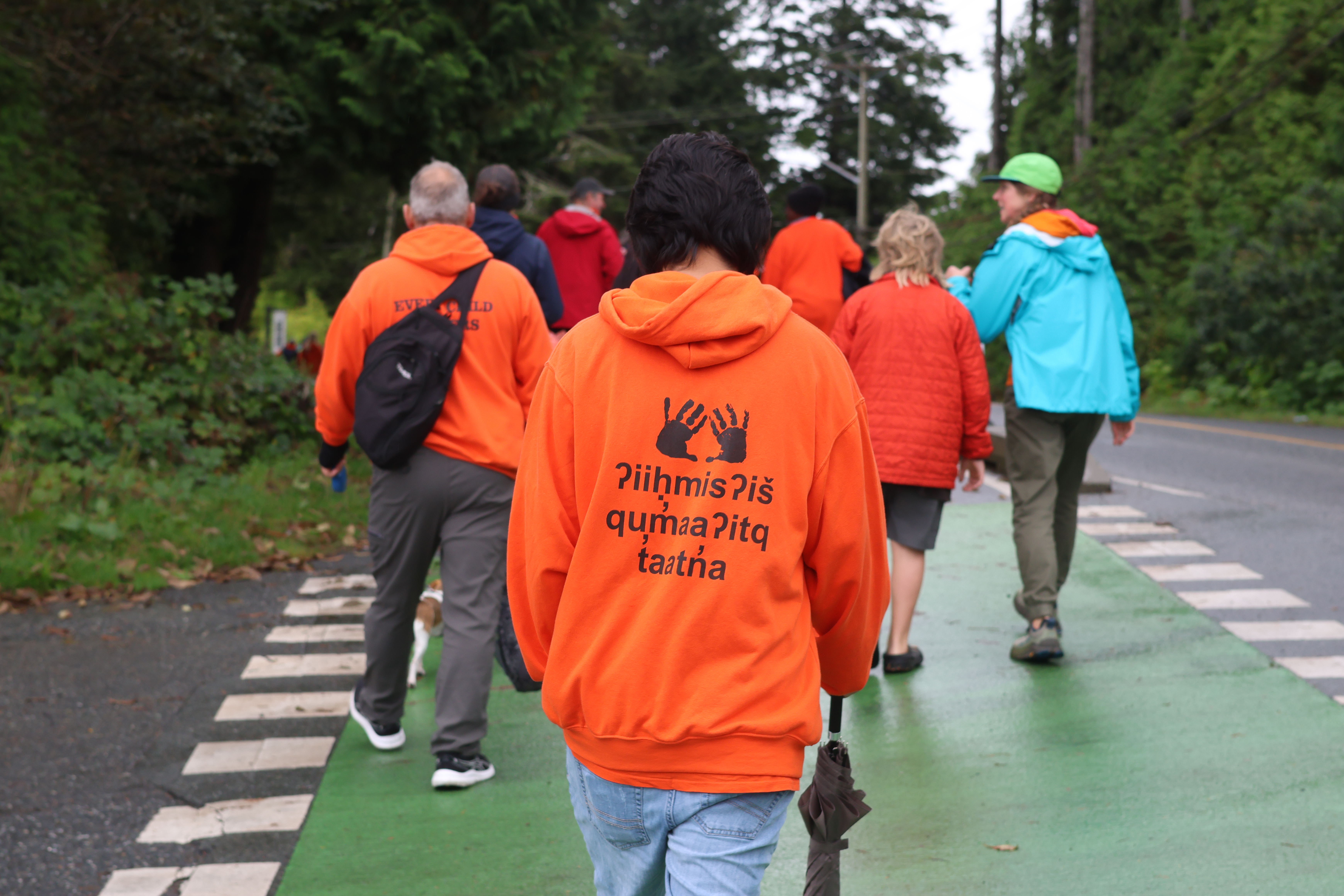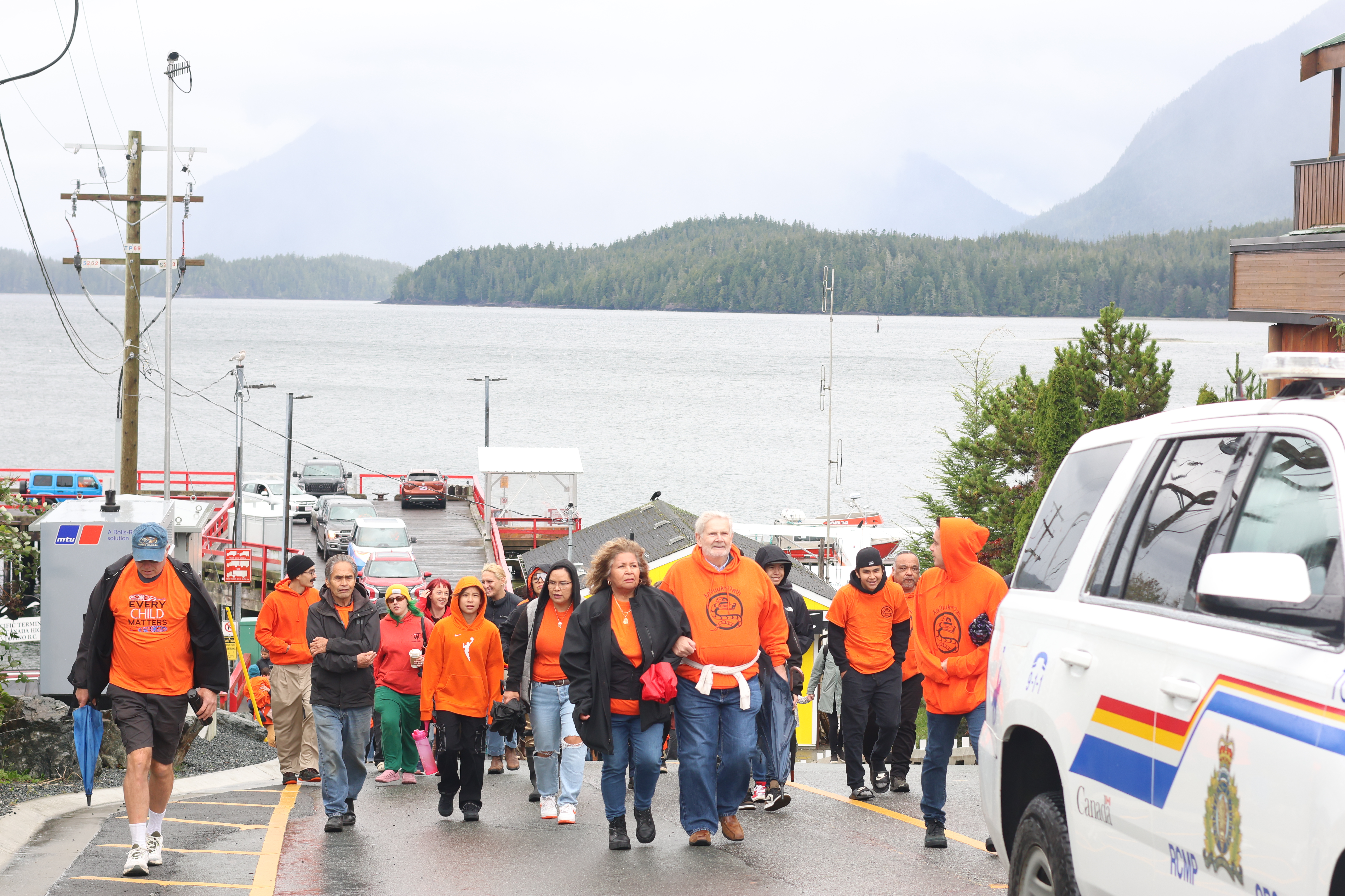 He couldn’t find his orange shirt for the annual Truth and Reconciliation Day Walk, but Tla-o-qui-aht gave him a new one, which he tucked in his jacket like a scarf.