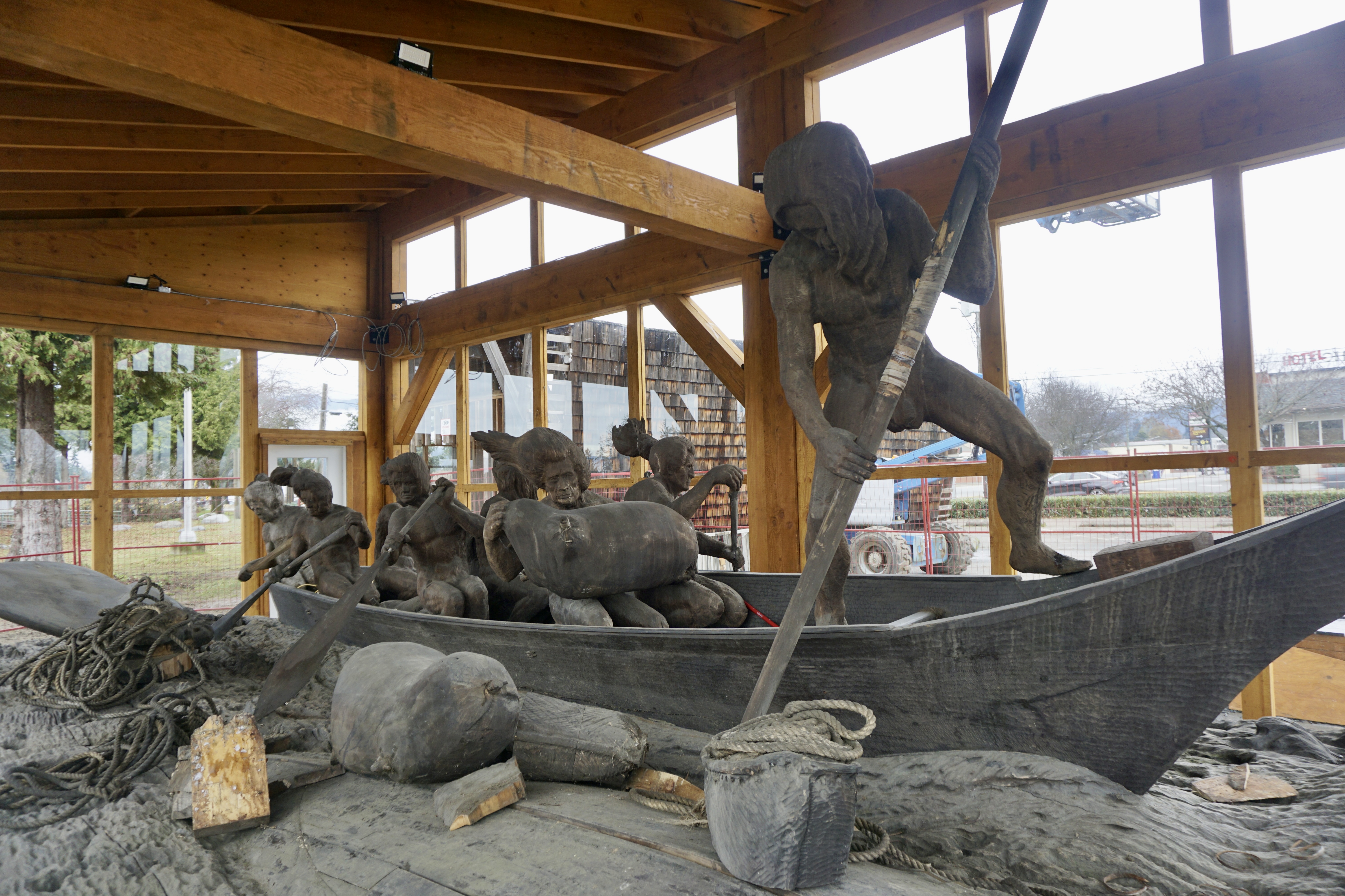 Artist Rodney Sayers from the Hupacasath First Nation, who carved the welcoming figures with Cecil Dawson, is tasked with putting the whaling monument back together after it was moved from the carving shed to its newly built home.