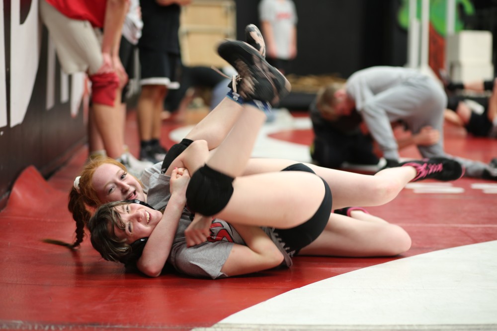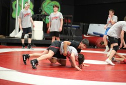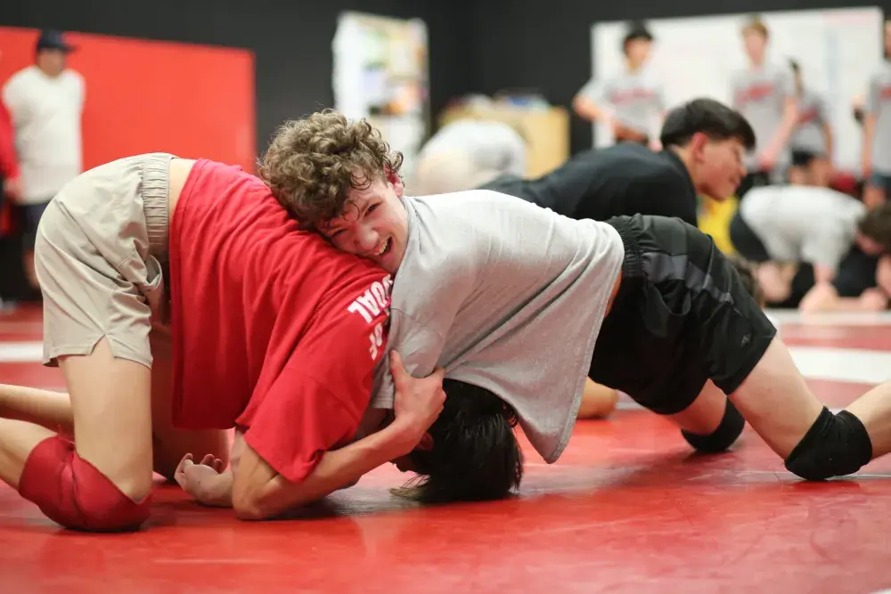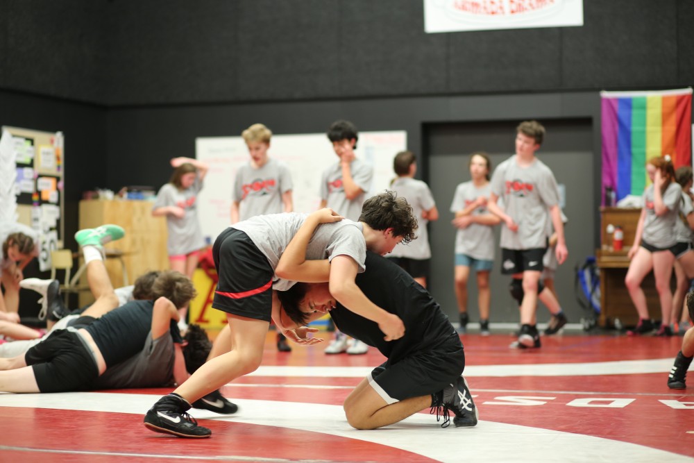 The two teammates are standing outside a room full of athletes grappling, with ‘Alberni Wrestling’ emblazoned on the wall high over the mats. They’re practicing techniques and strategy, after tumbling for a warm up.