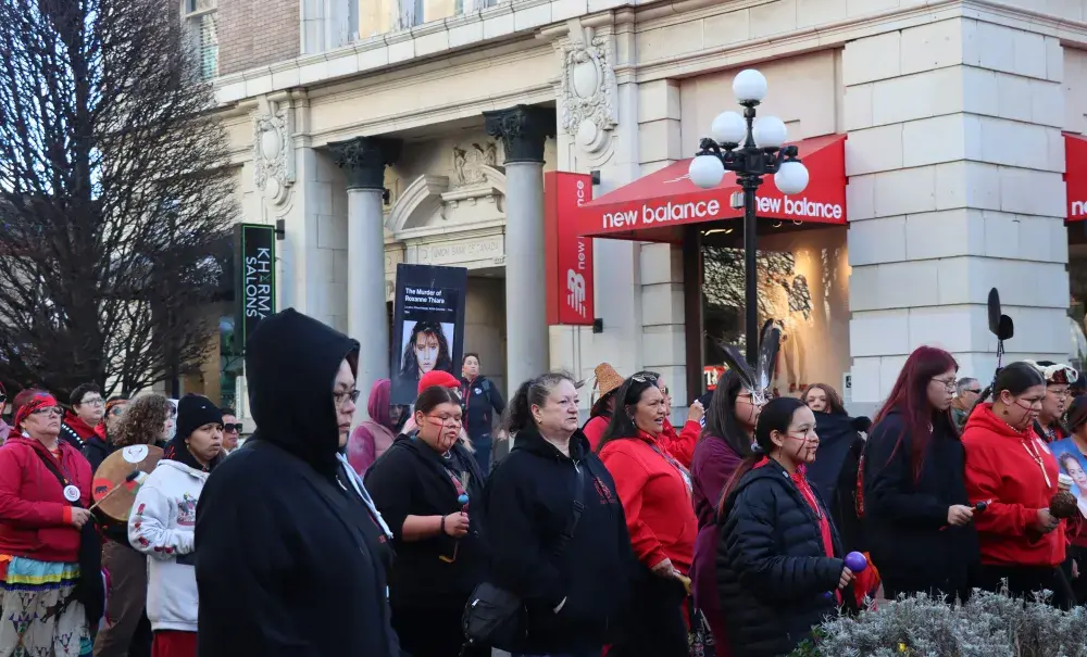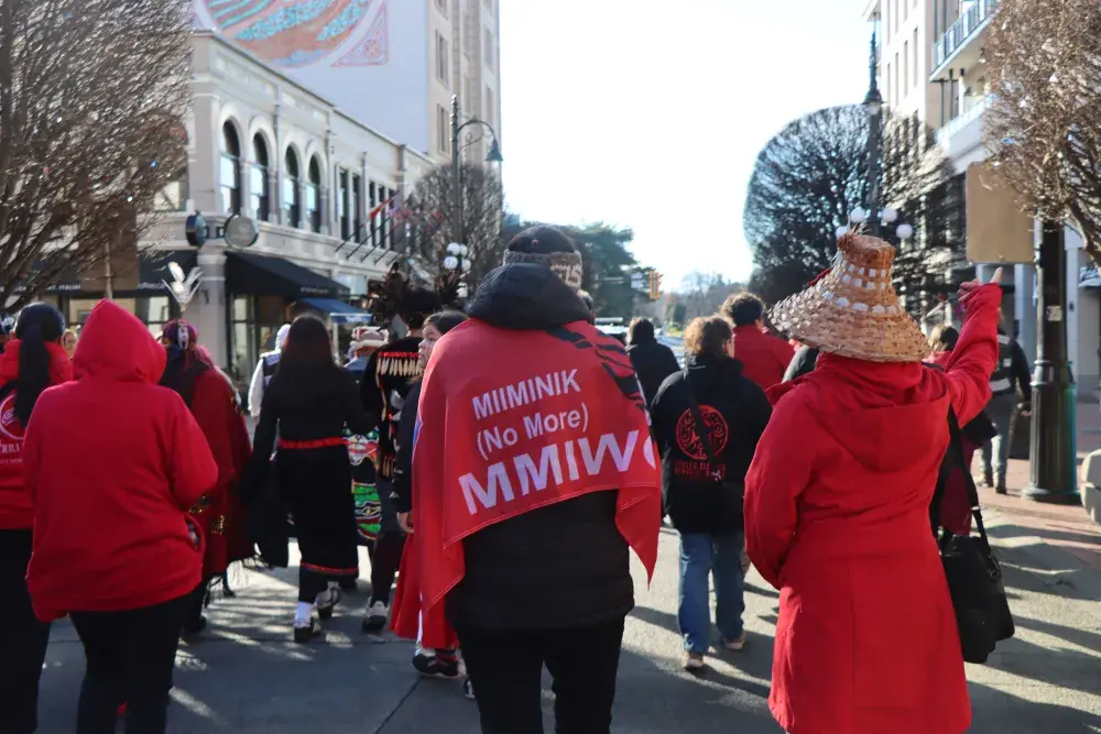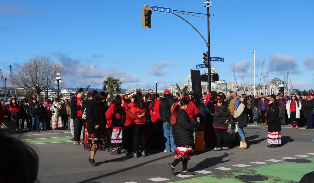 Hundreds dressed in red gathered in downtown Victoria on Feb. 14 to participate in the 17th annual Stolen Sisters Memorial March to honour missing and murdered Indigenous Peoples.