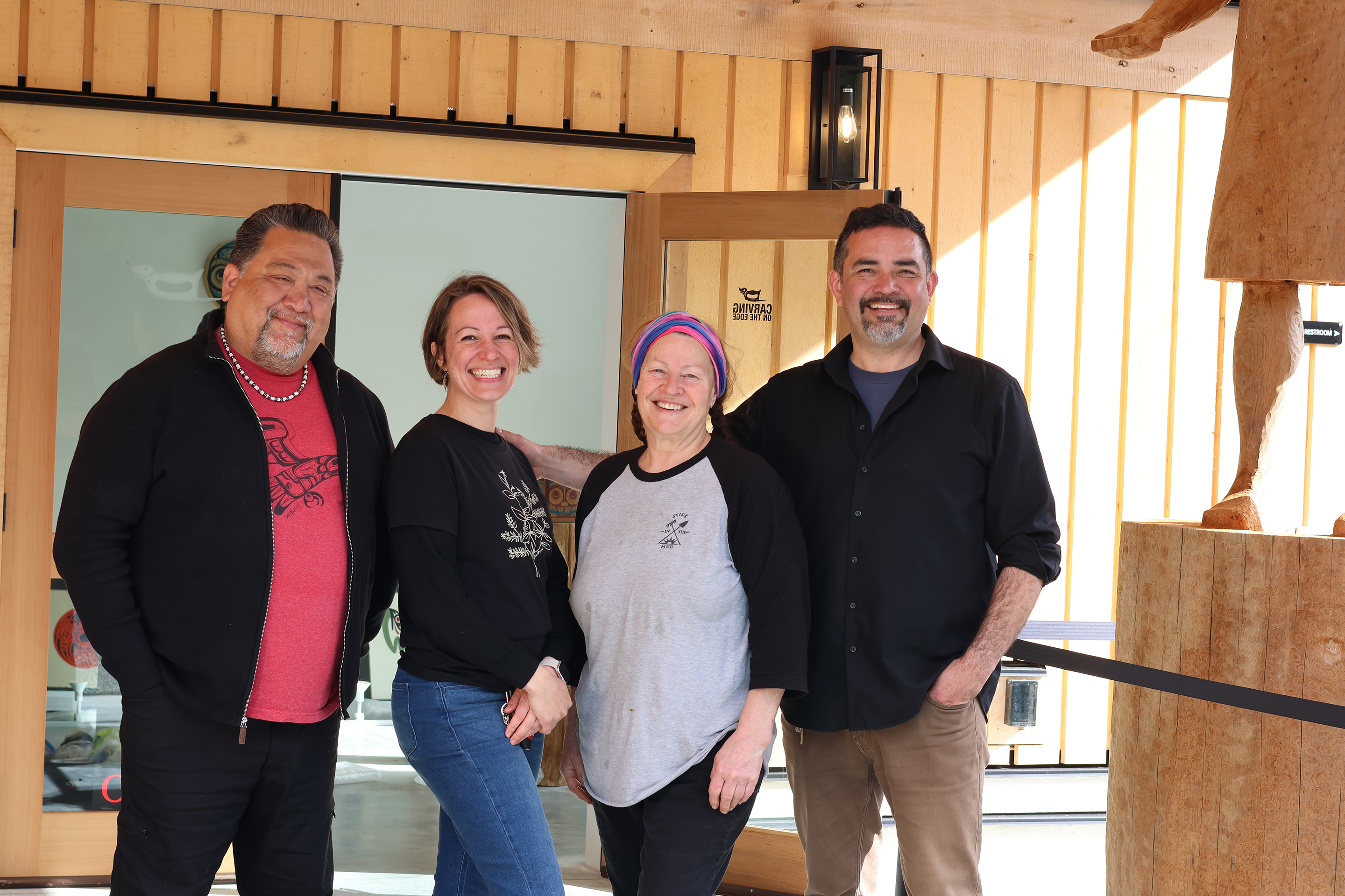 Two cedar welcome figures, carved by Tla-o-qui-aht First Nation Joe Martin, greet guests at the entrance of Clayoquot Campus with both arms open. Enns says the welcome figures symbolize the need for the two knowledge systems to come together for the collective well-being of future generations.