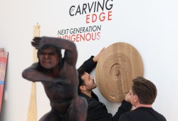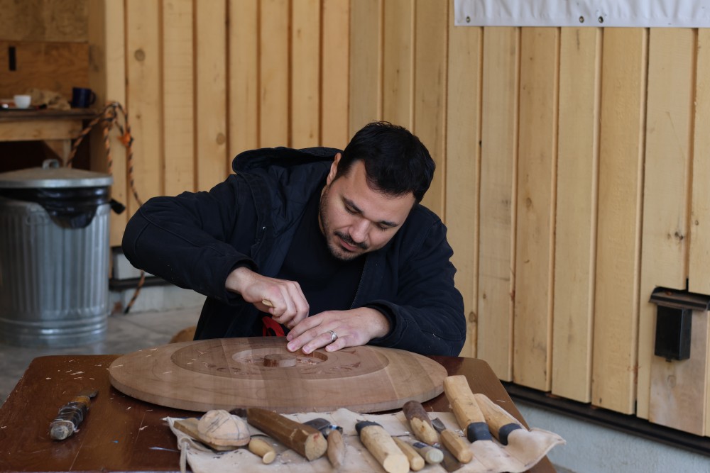 The scent of chiseled cedar filled the air as artist Josh Watts perfectly centered his latest carving on a white wall.